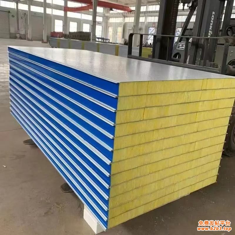 岩棉彩钢夹芯板产品特点:防火性能好,岩棉物为内芯层或玻璃纤维,可适合任意防火等级要求